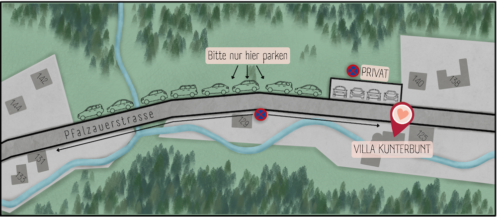 A1 Ausfahrt Pressbaum, von Wien ca. 30 Minuten Es besteht die Möglichkeit vor der Villa Kunterbunt zu parken.